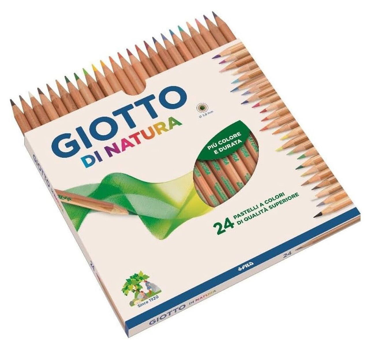 Pastelli realizzati in legno certificato proveniente da foreste a gestione sostenibile. E’ disponibile in 42 colori vivaci e brillanti. Mina extra-large di qualità superiore (3,8 mm), ricca di pigmenti coloranti per un’ottima resa ed una lunga durata: questo è Giotto di Natura, il lato naturale della creatività.