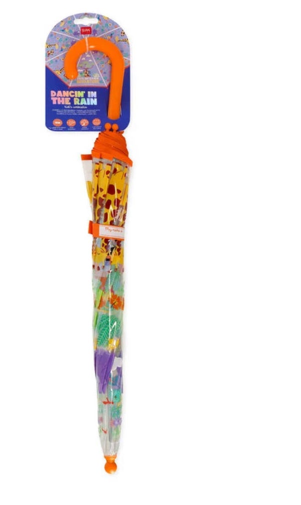 Se il tempo ti sembra brutto, perché non provare a renderlo più bello? Basta guardare il mondo attraverso l'Ombrello per Bambini - Dancin' in the Rain - Jungle di Legami: trasparente e colorato, trasforma ogni giorno di pioggia in un'occasione per portare in giro la propria allegria.
