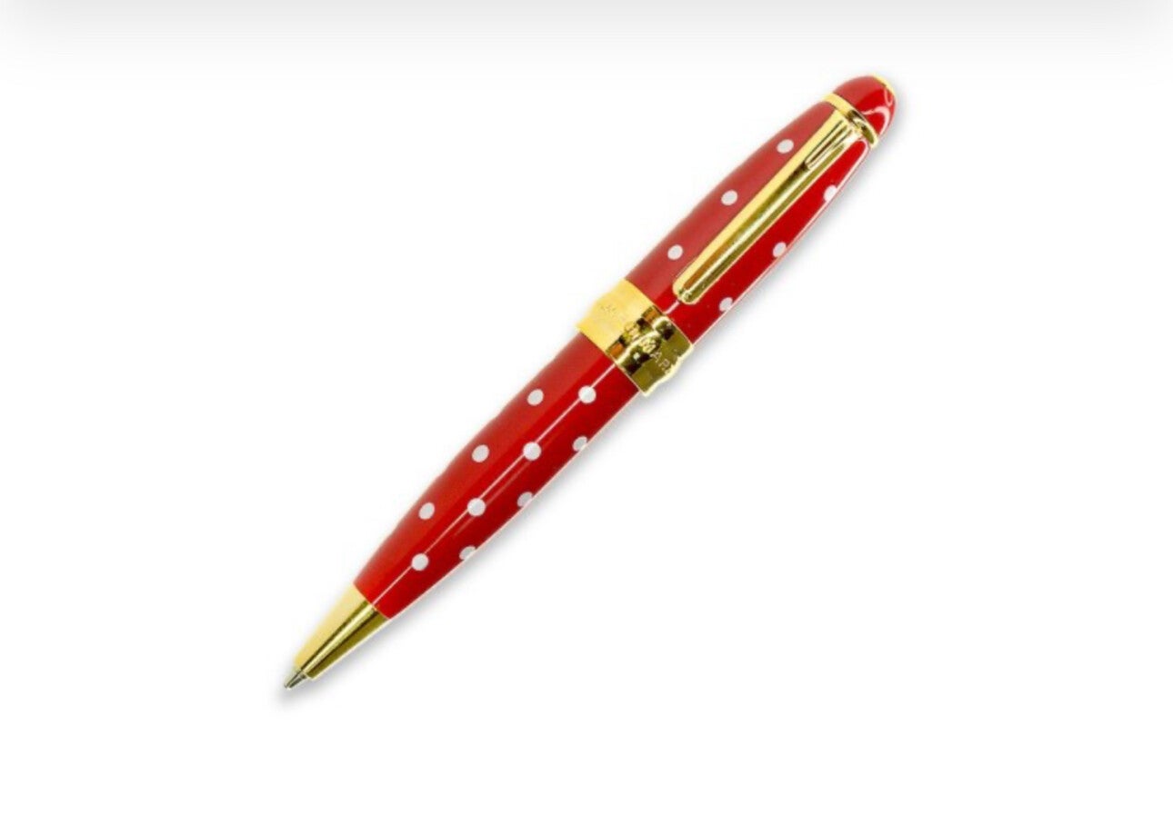 Il fusto e i componenti sono in ottone, la penna è caratterizzata da una laccatura di alta qualità e una divertente decorazione a pois. Le finiture in color oro donano un tocco di raffinatezza ed eleganza.