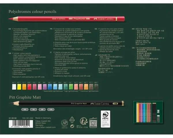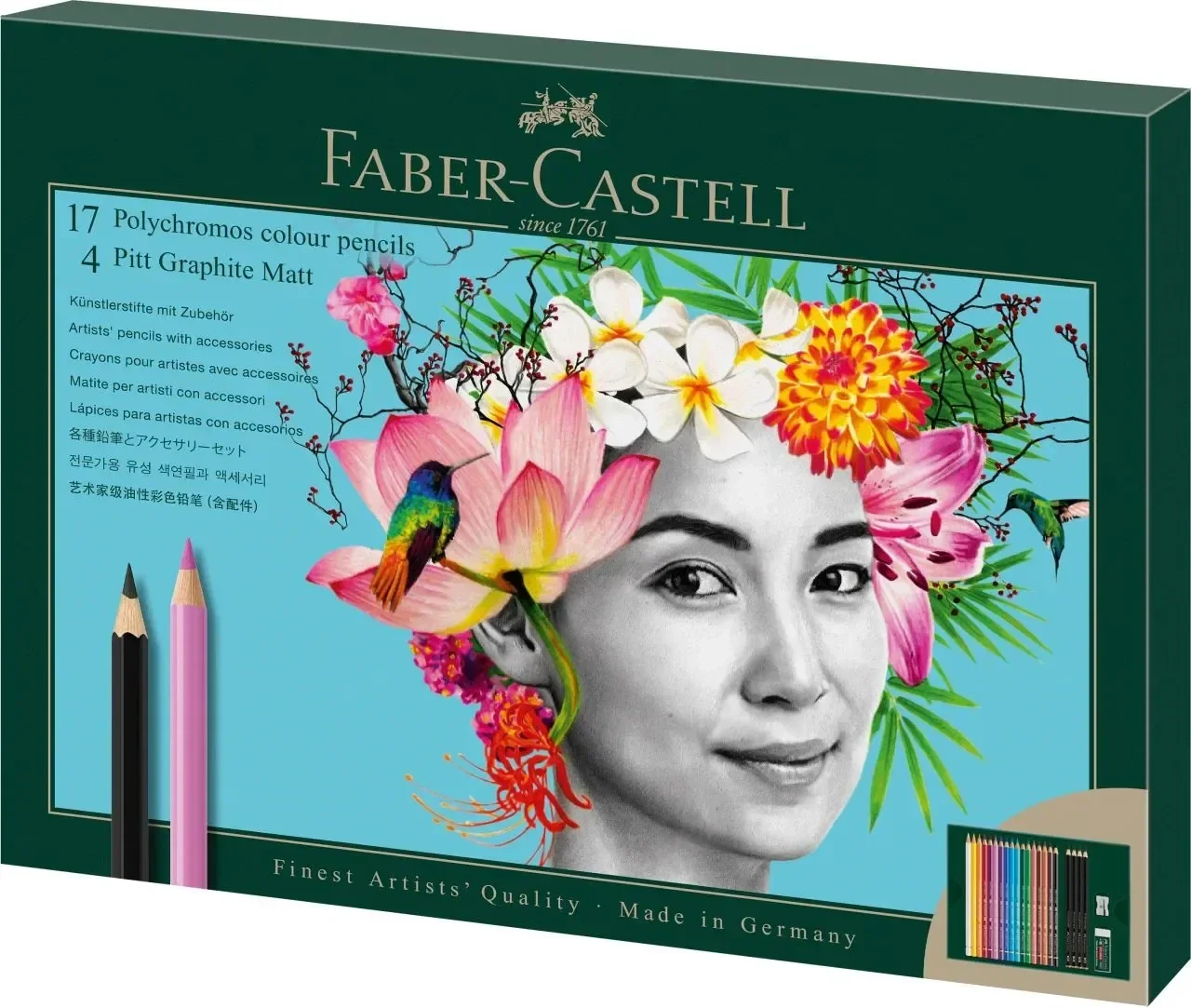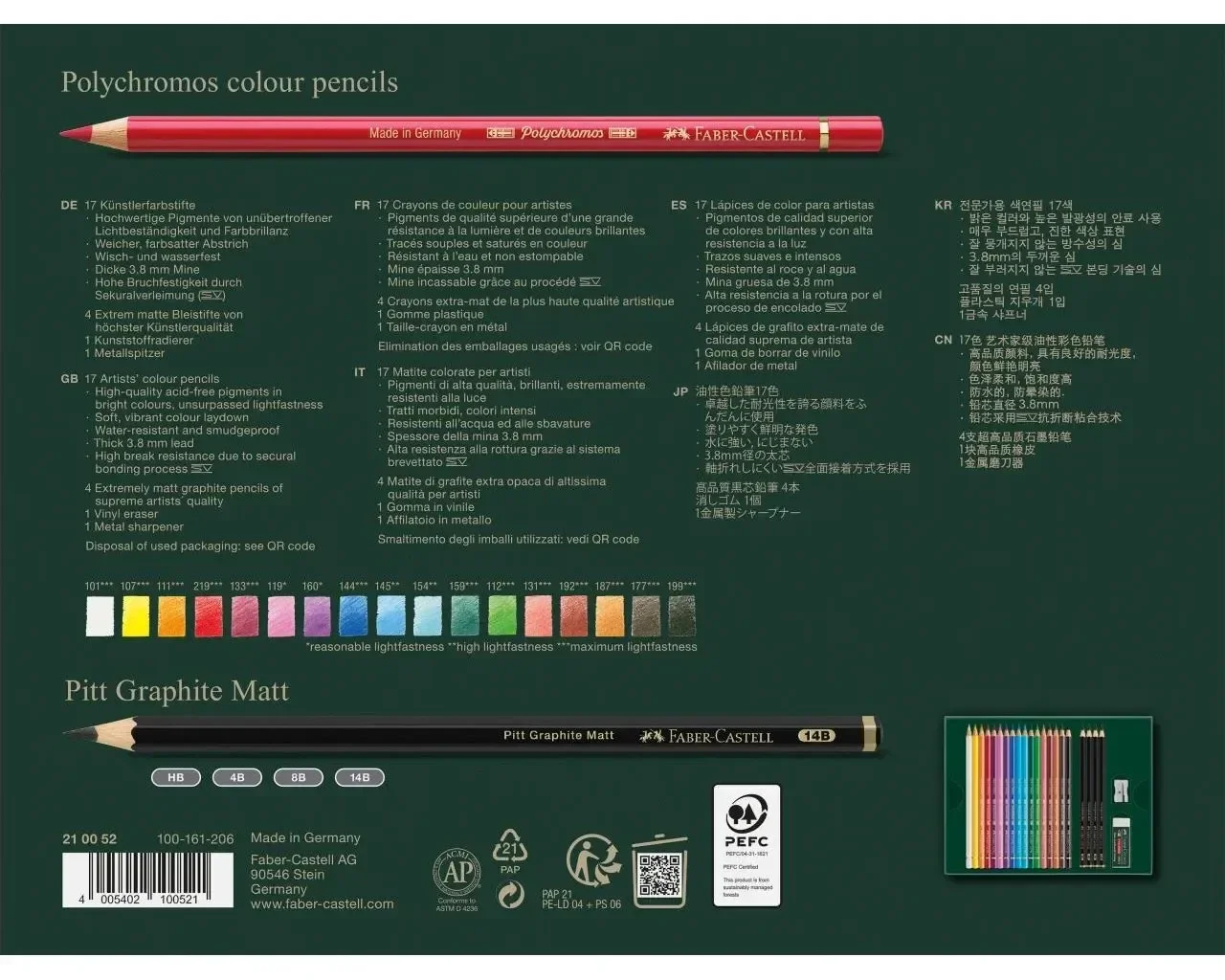 Scatola regalo in cartone Faber-Castell da 17 colori Polychromos e 4 matite Pitt con gomma e temperamatite (23 pezzi)