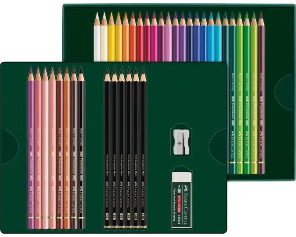 Scatola regalo in cartone Faber-Castell da 32 colori Polychromos e 6 matite Pitt con gomma e temperamatite (40 pezzi)