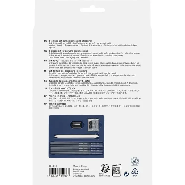 Contenuto: matite carboncino Goldfaber (extra soft, super soft, soft, media, dura), 1 sfumino, 1 temperamatite, 1 gomma pane