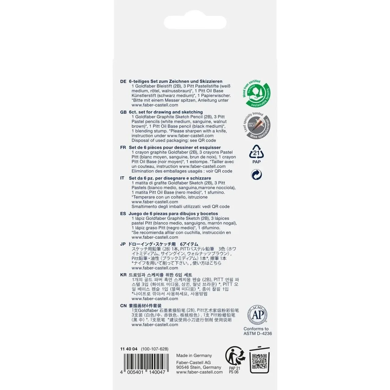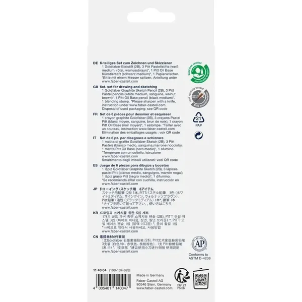 Contenuto: 1 matita di grafite Goldfaber 2B, 1 Pitt Oil Base nero medio, 1 matita pastello Pitt bianco medio, 1 matita pastello senza oli Pitt sanguigno, 1 matita pastello senza oli Pitt seppia chiaro, 1 tergicarta.