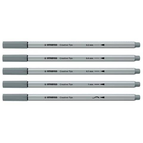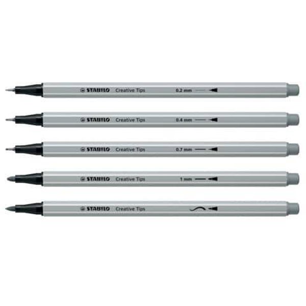 Set Stabilo creative tips contenente: tre penne fineliner, un pennarello classico e un brush pen di colore nero e di clore grigio per un totale di 10 pezzi. Ampiezza di tratto da 0,2 mm a 1 mm. L'inchiostro a base d'acqua rende semplicissimo creare favolosi effetti acquarello. Tappo ventilato anti-soffocamento.
