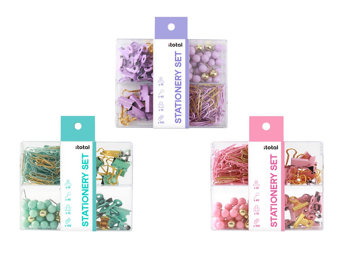 Set di cancelleria composto da 40 puntine, 100 graffette, 10 pinze e 10 double clip in un pratico scatolino in plastica 10x12,5x3.