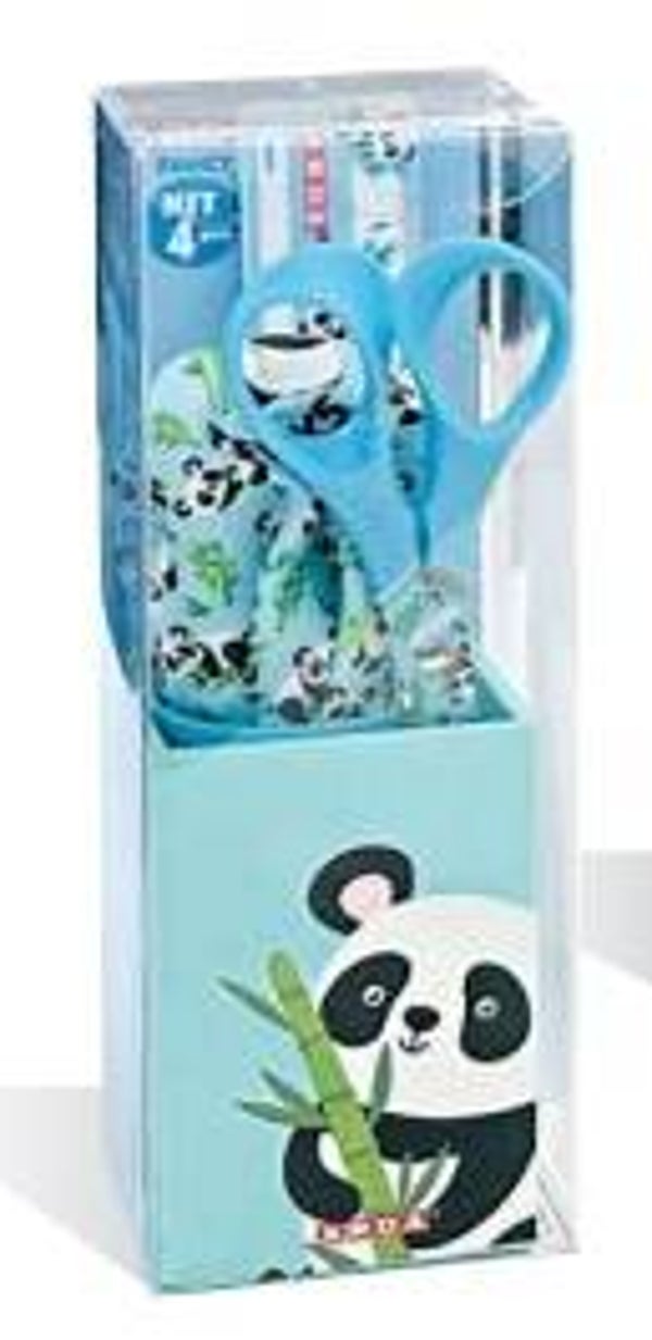 Kit composto da un righello da 16 cm, Temperamati te TENKS da 3 fori in metallo con serbatoio in stoffa, un portapenne e forbici da 13 cm linea Fancy di Arda