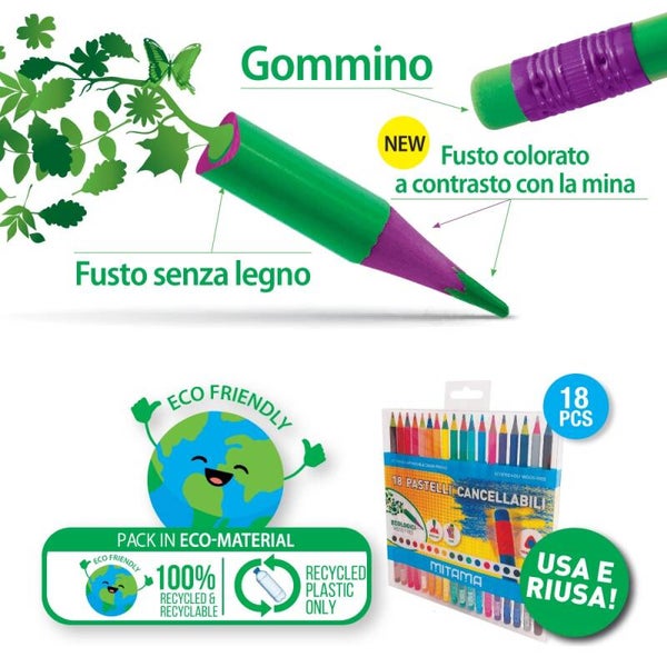 WOOD FREE: grazie all’utilizzo della resina al posto del legno i pastelli cancellabili sono rispettosi dell’ambiente, resistenti e coloratissimi!