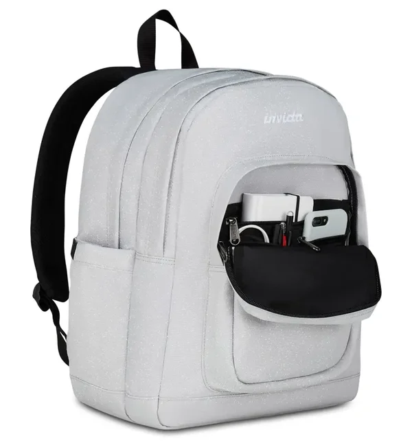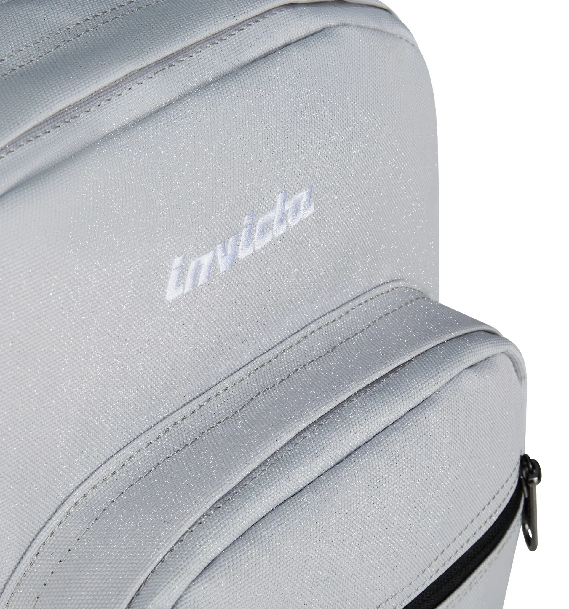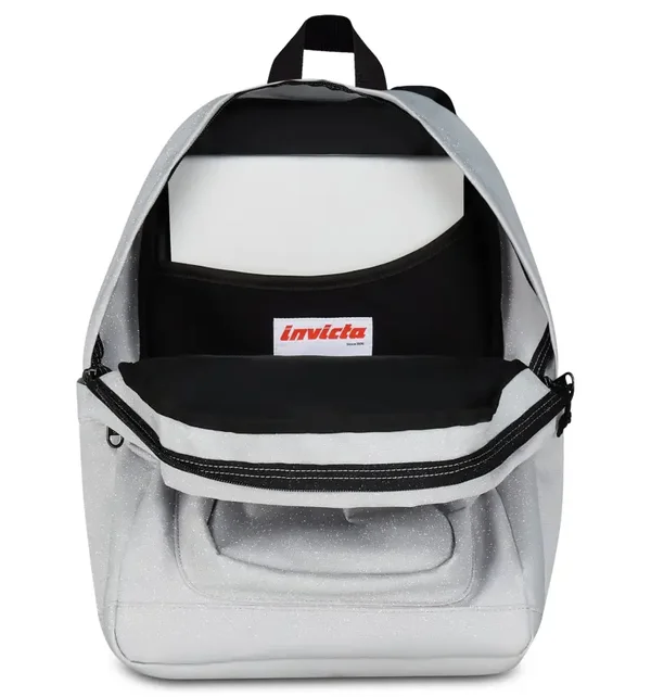 Schienale Imbottito e rivestito in tessuto. Capacità34 lt Dimensioni32 x 43 x 25 cm - Doppio scomparto, fondo interno rinforzato a ribalta, logo Invicta ricamato, etichetta alta definizione all’interno, tirazip con cordino, finitura scintillante.Doppia tasca frontale, tasche laterali porta borraccia, tasca interna con organizer, scomparto interno porta pc 14" (fino a 33x22,6x1,8 cm). Spallacci Imbottiti e rivestiti in tessuto. Sotto spallaccio in rete.Tessuto100% Poliestere riciclato, certificato "GRS"