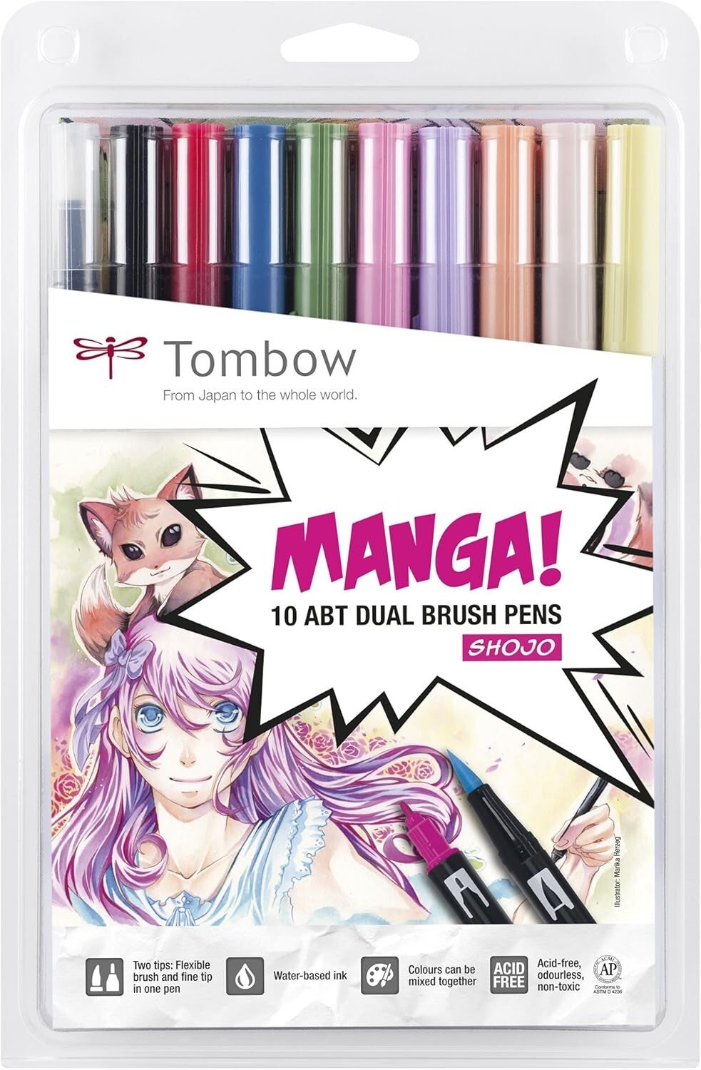 Il Tombow Shojo è un set di 10 pennarelli ABT Dual Brush Pen, progettato per il disegno di manga Shojo. Ogni pennarello ha due punte: una fine per linee precise e una flessibile a pennello per sfumature e tratti dinamici. I colori sono a base d'acqua, quindi possono essere miscelati e utilizzati per effetti acquerello