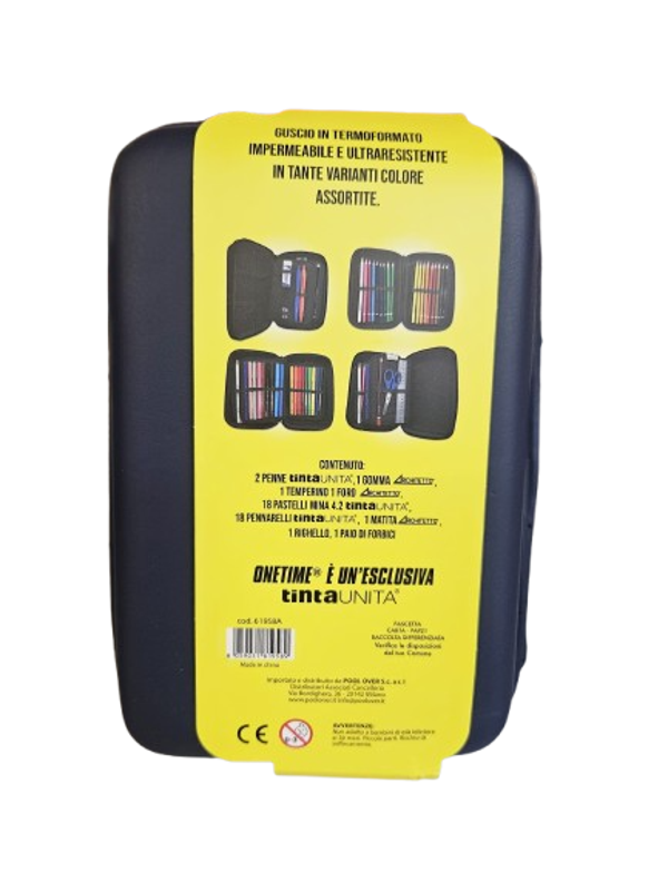 18 pastelli mina 4.2 - 18 pennarelli - 1 matita hb - 2 penne - 1 temperino 1 foro - 1 gomma - 1 righello 16cm - 1 paio di forbici