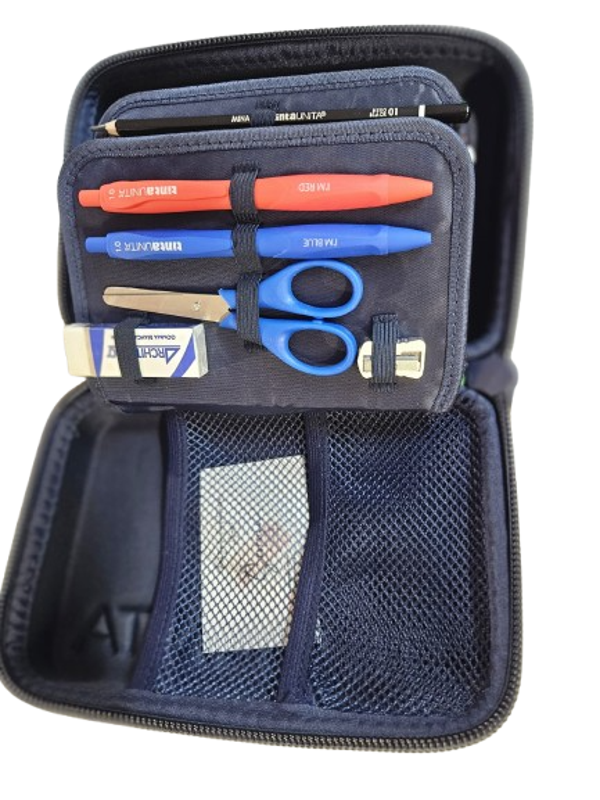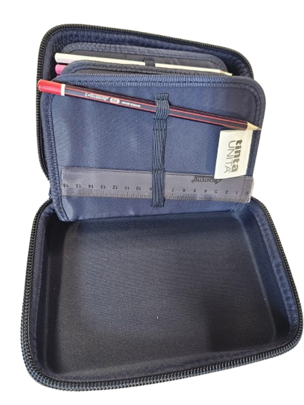 Astuccio accessoriato "a 3 piani" che si apre con una sola zip. Scocca rigida in termoformato impermeabile e ultraresistente