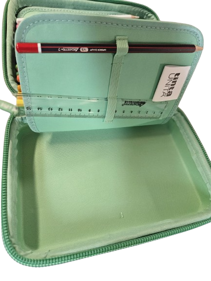 Astuccio accessoriato "a 3 piani" che si apre con una sola zip. Scocca rigida in termoformato impermeabile e ultraresistente