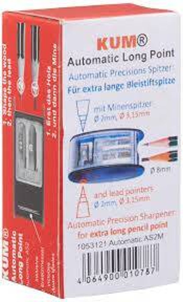 Il KUM AS2M è un temperino professionale con sistema Automatic Long Point, progettato per ottenere punte lunghe e affilate con il massimo controllo. Rispetto al modello AS2, l’AS2M include anche affilatori per mine da disegno tecnico.