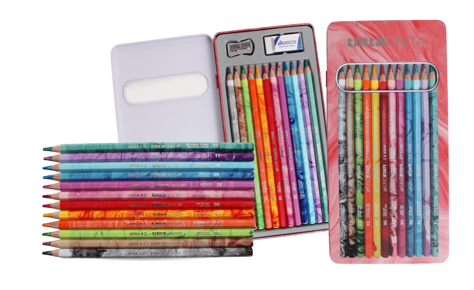 La Metal Box GRADIENT contiene: 12 pastelli Gradient Mina 4.2 TintaUNITA 1 temperino 1 foro ARCHITETTO 1 gomma mini ARCHITETTO