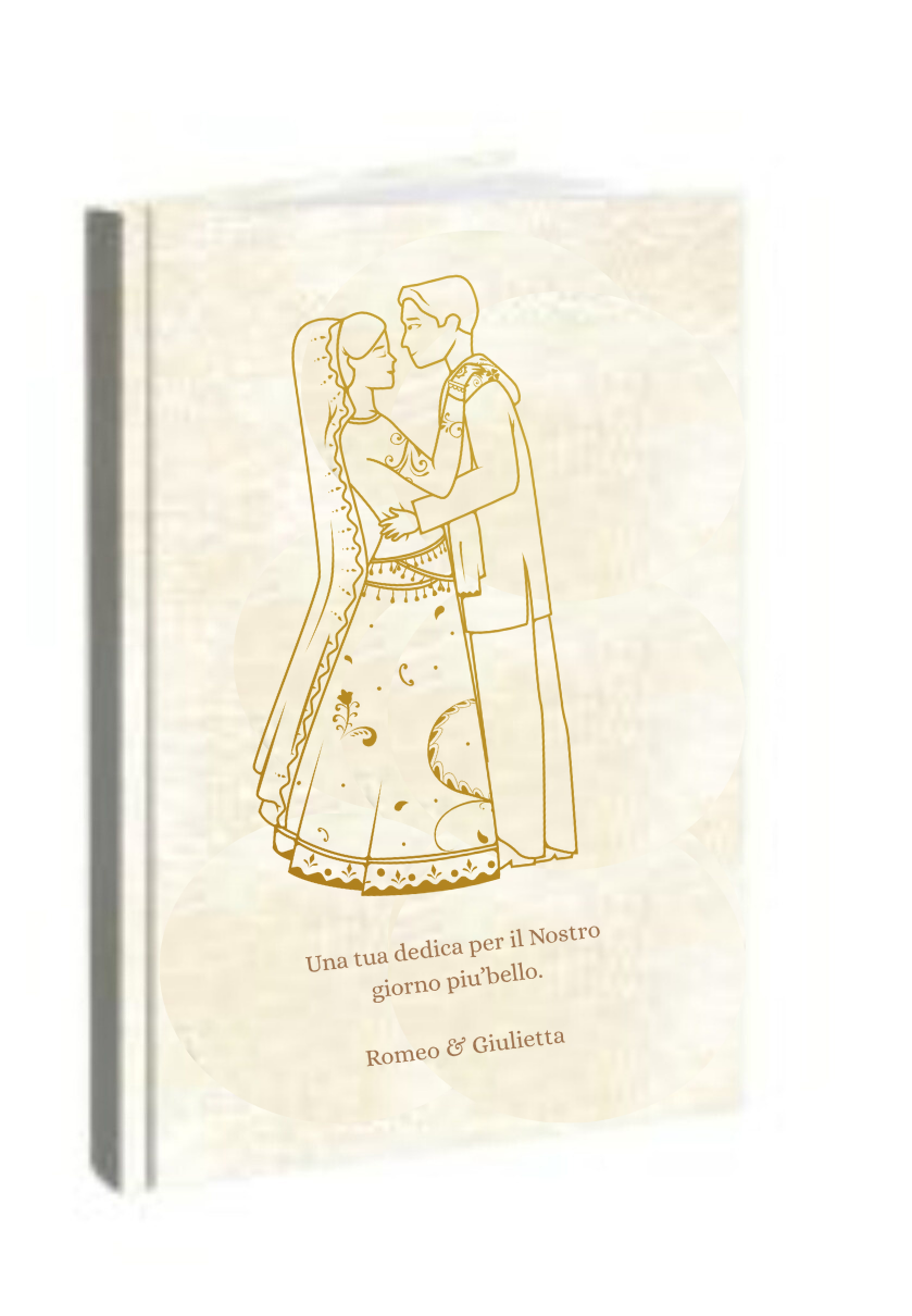 Copertina stampata con decoro e frase "Una tua dedica per il Nostro giorno più bello" (esattamente come in foto) con aggiunta dei nomi degli sposi.