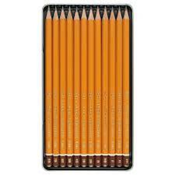 set di 12 matite in grafite Koh-I-Noor della serie 1500, con gradazioni morbide da 8B a 2H, contenute in un elegante astuccio in metallo giallo. Ideale per disegno artistico, schizzi, ombreggiature e scrittura espressiva.