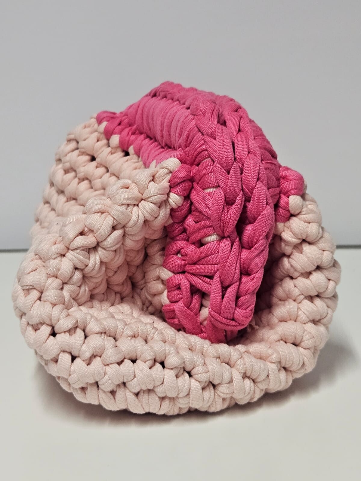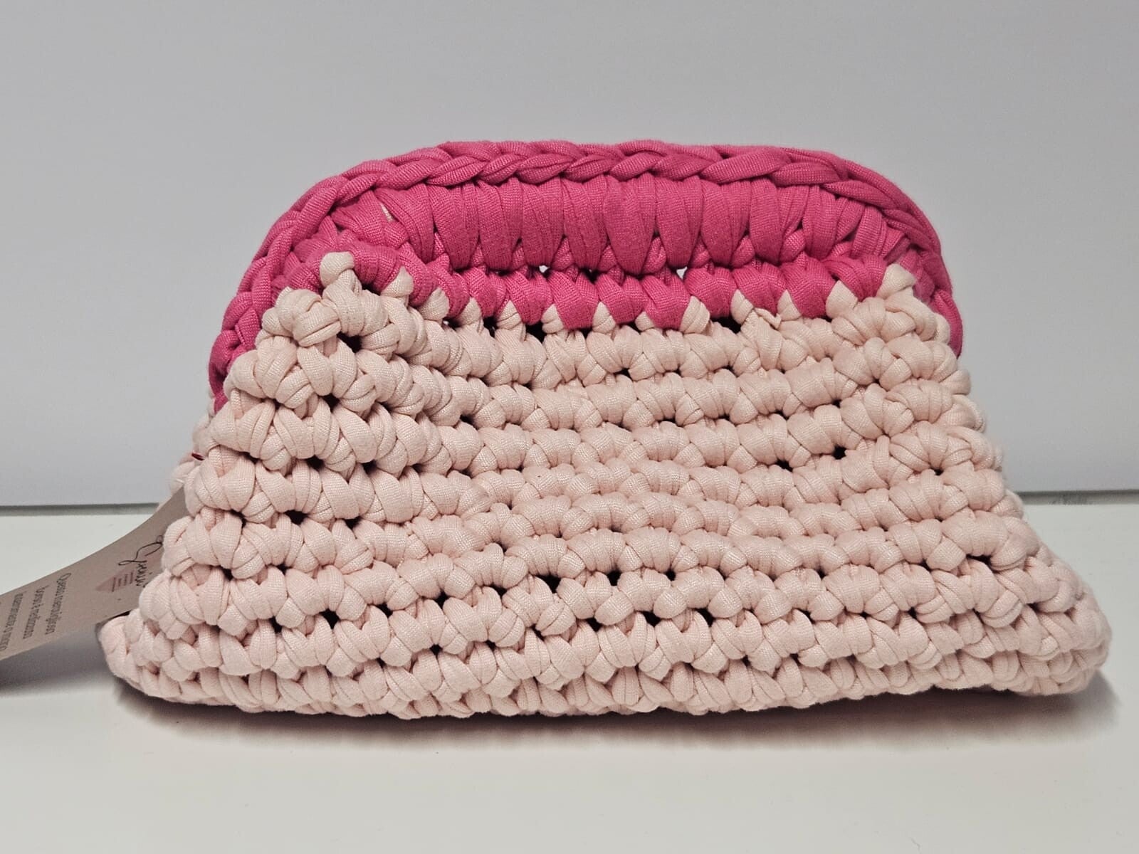 Un’esplosione di stile e personalità: questa clutch firmata Sereniu® è realizzata interamente a mano con filato in lycra 100%, intrecciato con cura in una vibrante combinazione di rosa cipria e magenta. Il design compatto e la texture corposa la rendono un accessorio audace e raffinato, perfetto per aggiungere un tocco creativo a ogni outfit.