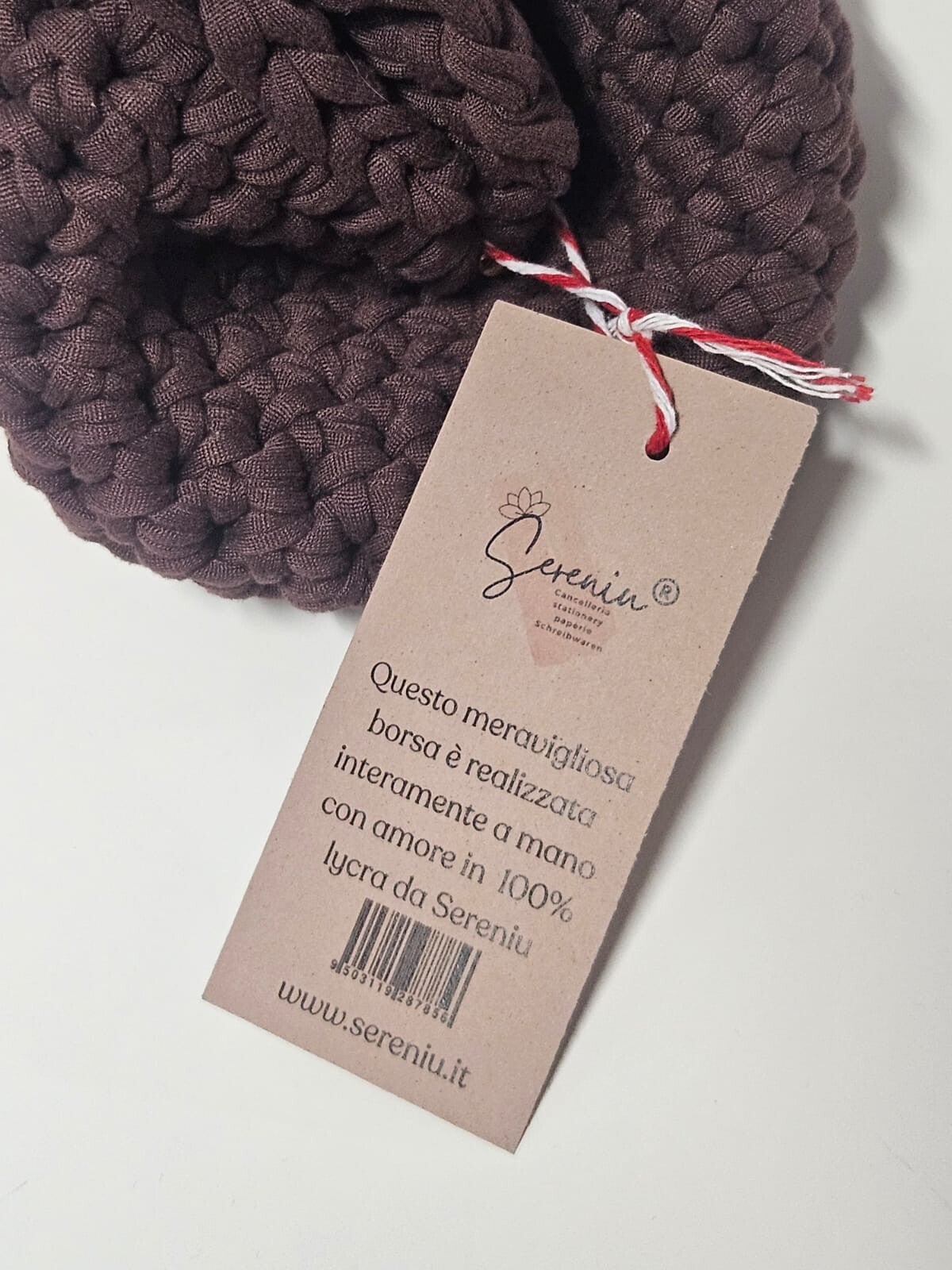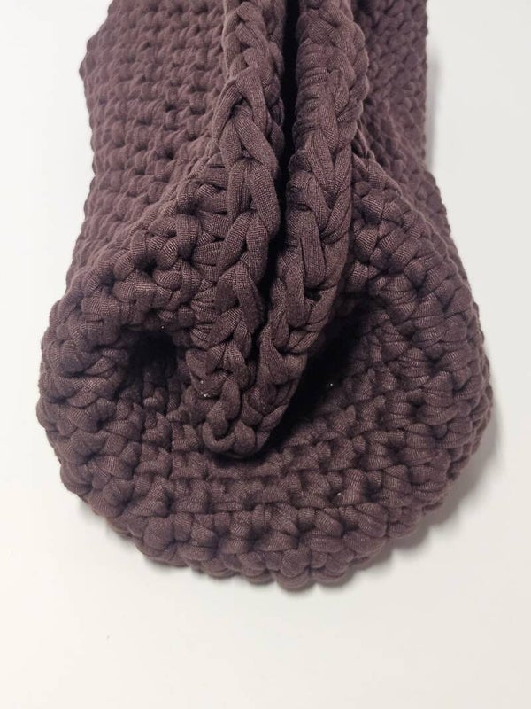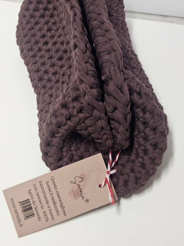 Calda, materica e dal fascino naturale: questa clutch Sereniu® è realizzata interamente a mano con filato in lycra 100%, intrecciato in una profonda tonalità marrone. La lavorazione compatta e la molla da 20 cm le conferiscono struttura e praticità, rendendola perfetta per chi ama l’eleganza discreta e l’artigianato autentico.