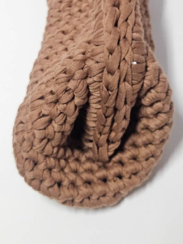 Calda, elegante e dal fascino senza tempo: questa clutch Sereniu® è realizzata interamente a mano con filato in lycra 100%, intrecciato in una sofisticata tonalità cuoio. La texture compatta e la molla da 20 cm le conferiscono struttura e praticità, rendendola ideale per chi ama accessori artigianali dal carattere deciso e naturale.