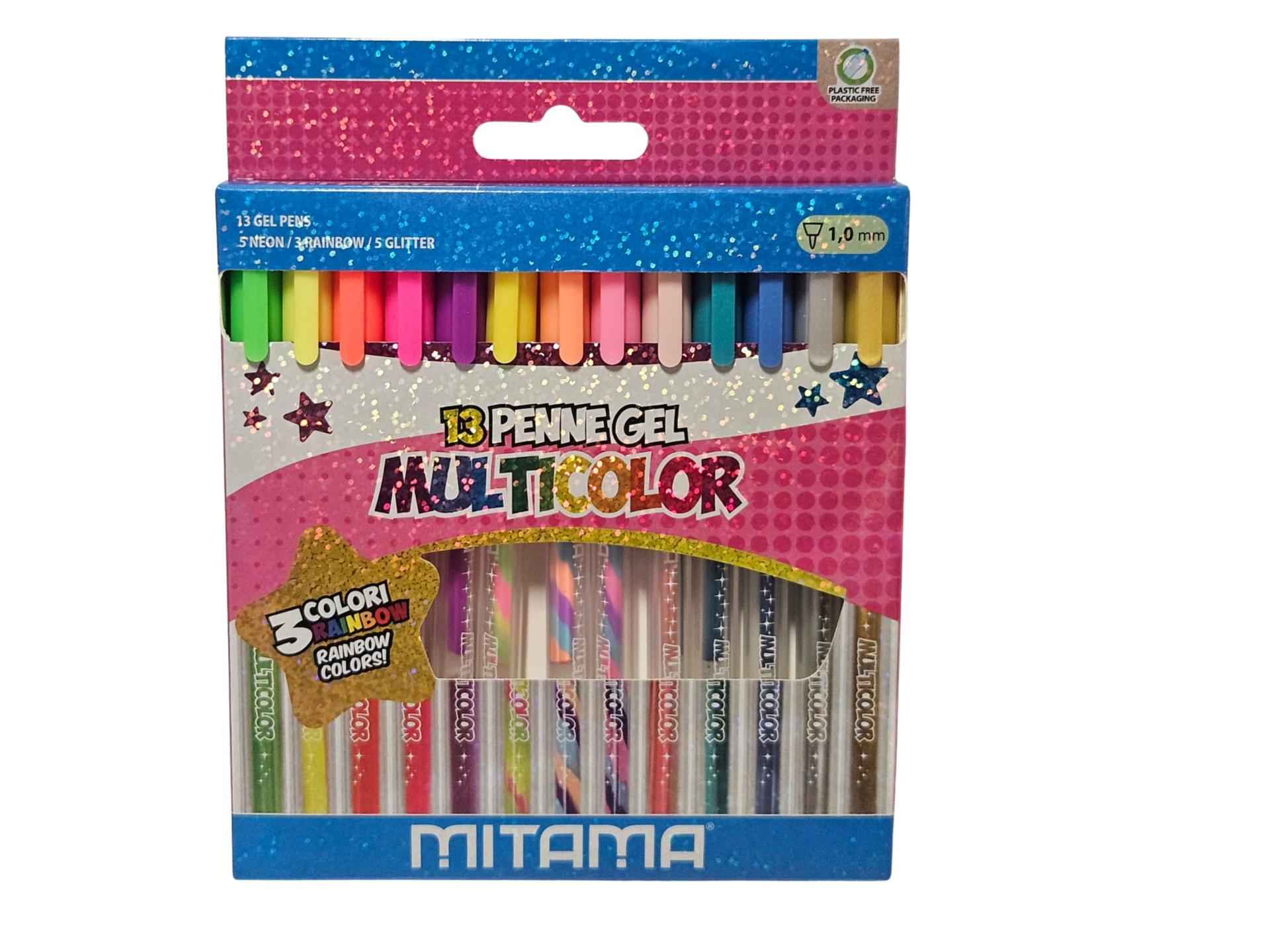 Scopri il mondo del colore con le penne gel MITAMA Multicolor! Un set completo di 13 penne dai tratti brillanti e originali, perfette per scrivere, decorare e dare vita alla tua creatività.