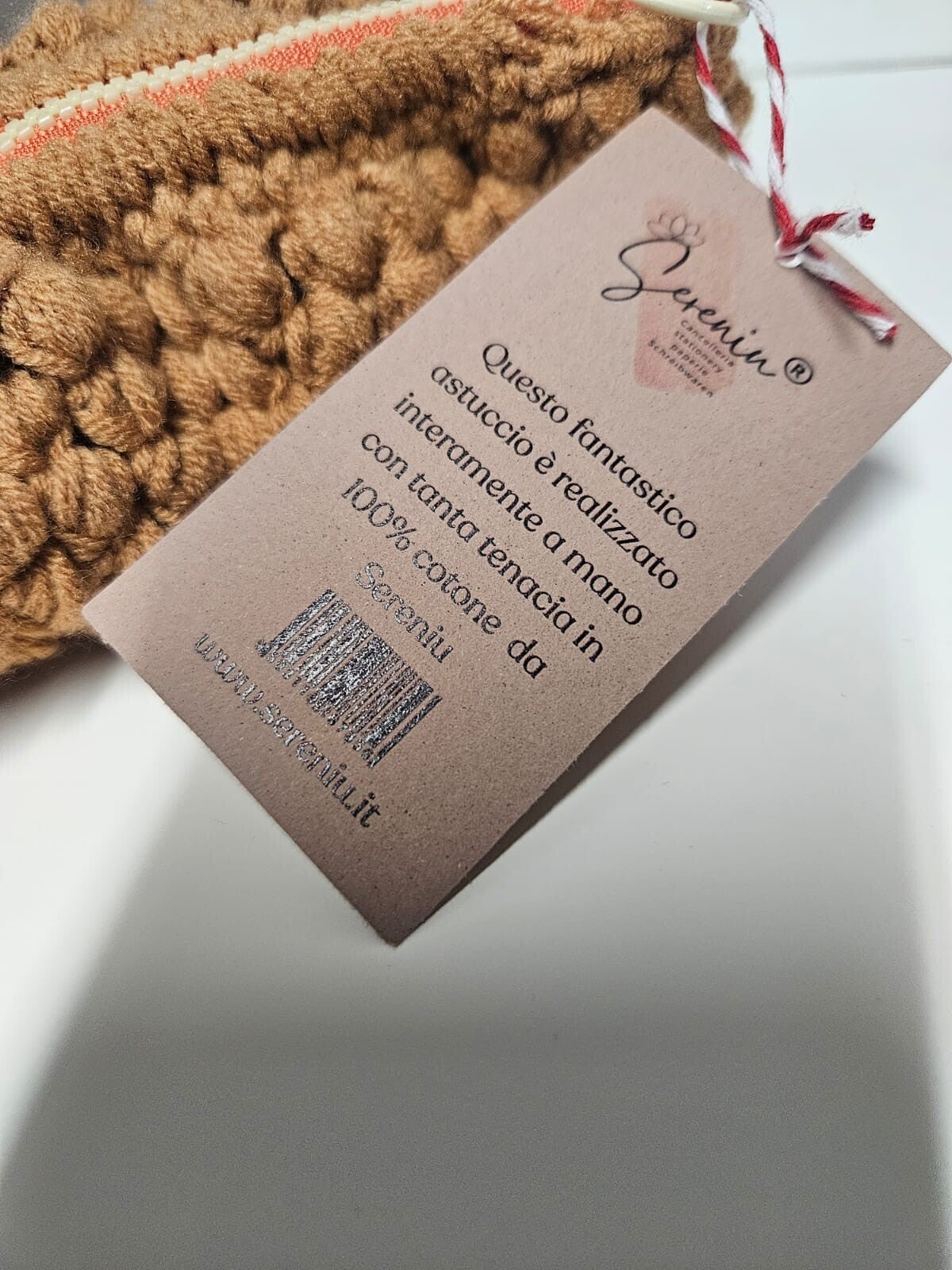 Un accessorio unico, realizzato interamente a mano con cura e tenacia da Sereniu®. Questo astuccio è lavorato con filato 100% cotone, utilizzando una tecnica a rilievo che dona una texture tridimensionale e un tocco sofisticato. Il colore marrone caldo si abbina armoniosamente alla cerniera bicolore arancione e beige, creando un contrasto elegante e moderno.