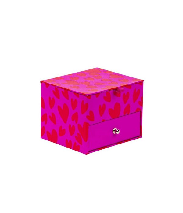 Portagioie prodotto in cartone rivestito linea Happy Hearts di Cartomania che unisce funzionalità e stile, grazie al comodo cassetto e allo specchio a forma di cuore integrato.