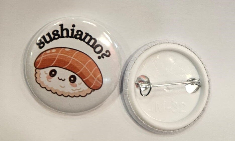 Aggiungi un tocco di dolcezza e originalità al tuo outfit con la nostra spilletta "Sushiamo?"! Questa spilla rotonda dal design stile kawaii ritrae un simpatico nigiri al salmone sorridente, perfetto per chi non può resistere al fascino della cucina giapponese.