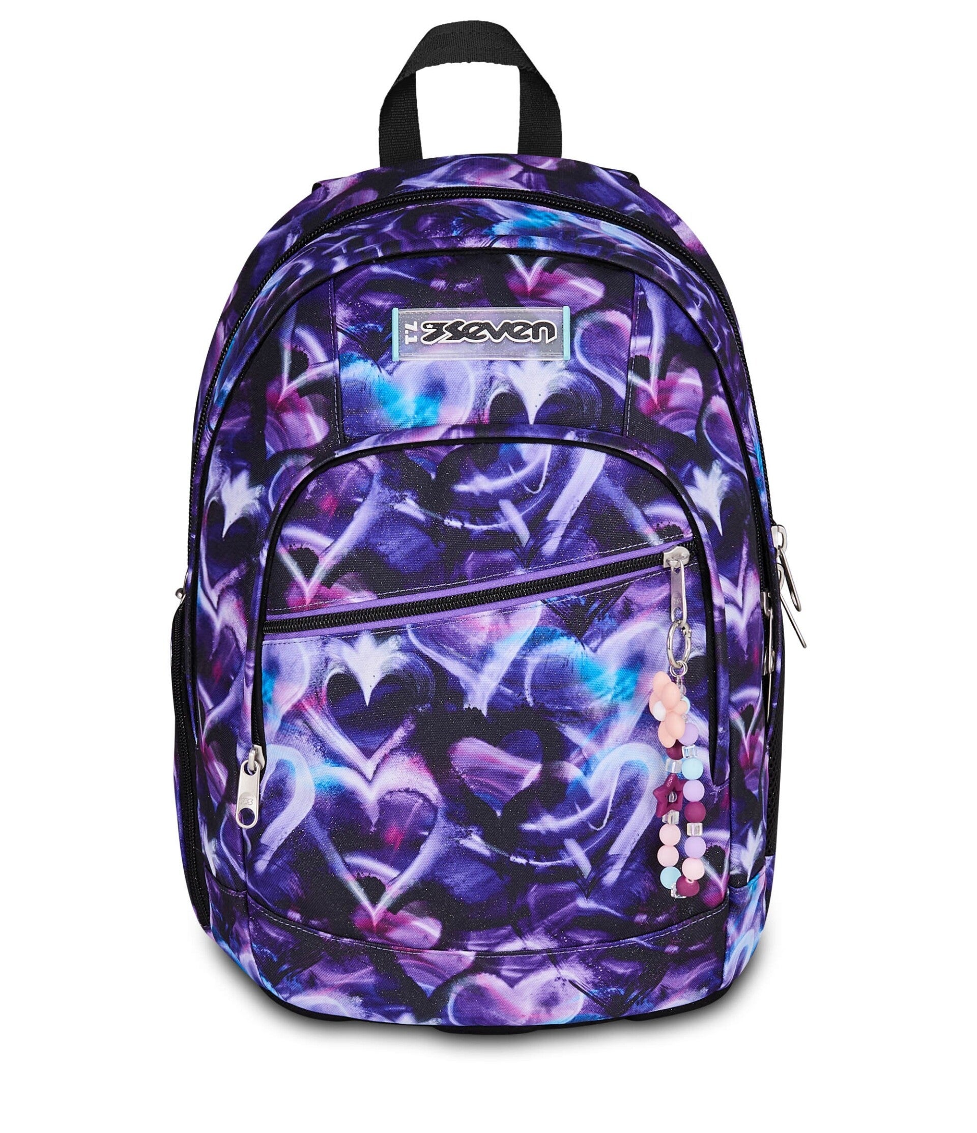 Lo zaino Seven Dual Lovepass è la scelta ideale per le ragazze che affrontano le scuole medie o superiori con energia e voglia di esprimere la propria personalità. La sua grafica all-over con cuori stilizzati nei toni del viola, blu e fucsia, arricchita da un originale charm a forma di fiore, lo rende unico e super trendy.