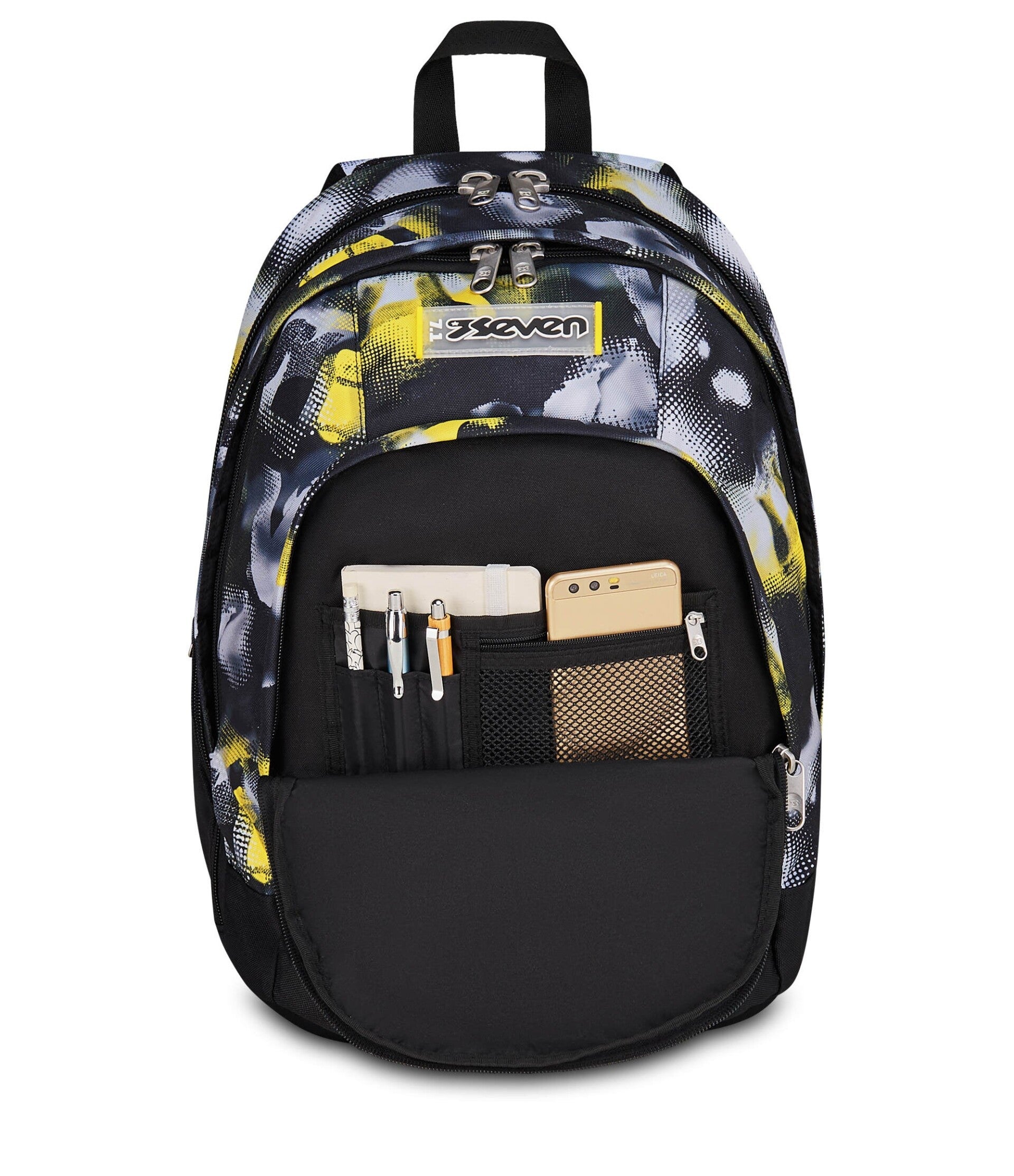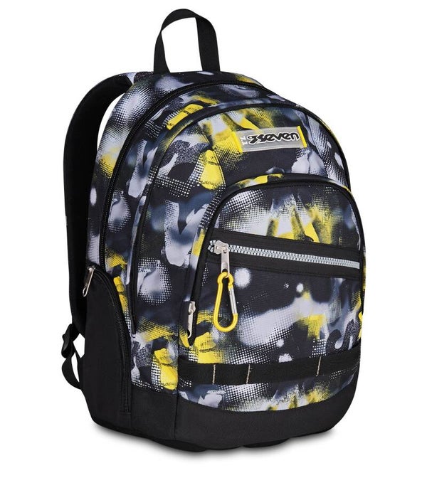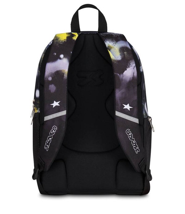 Lo zaino Seven Dual Golden Paint si distingue per il suo stile grintoso e moderno. La grafica astratta bicolore, che accosta il nero profondo a pennellate giallo oro, è arricchita da dettagli tecnici come la maxi zip frontale e il portachiavi a moschettone giallo fluo, perfetti per chi cerca un look "streetwear" per la scuola.